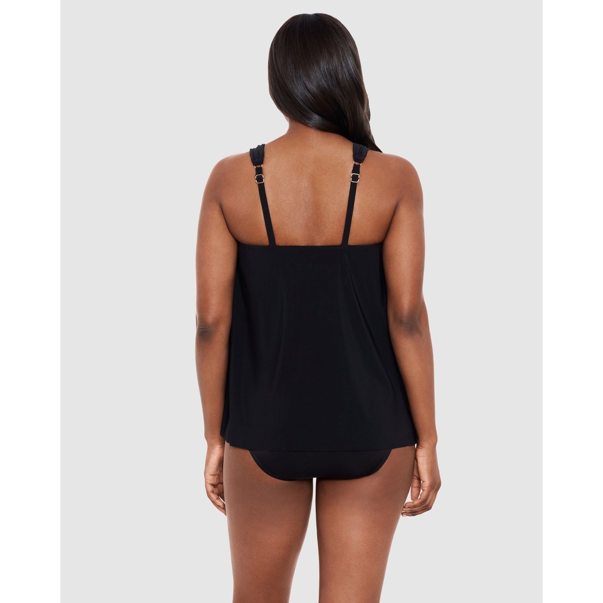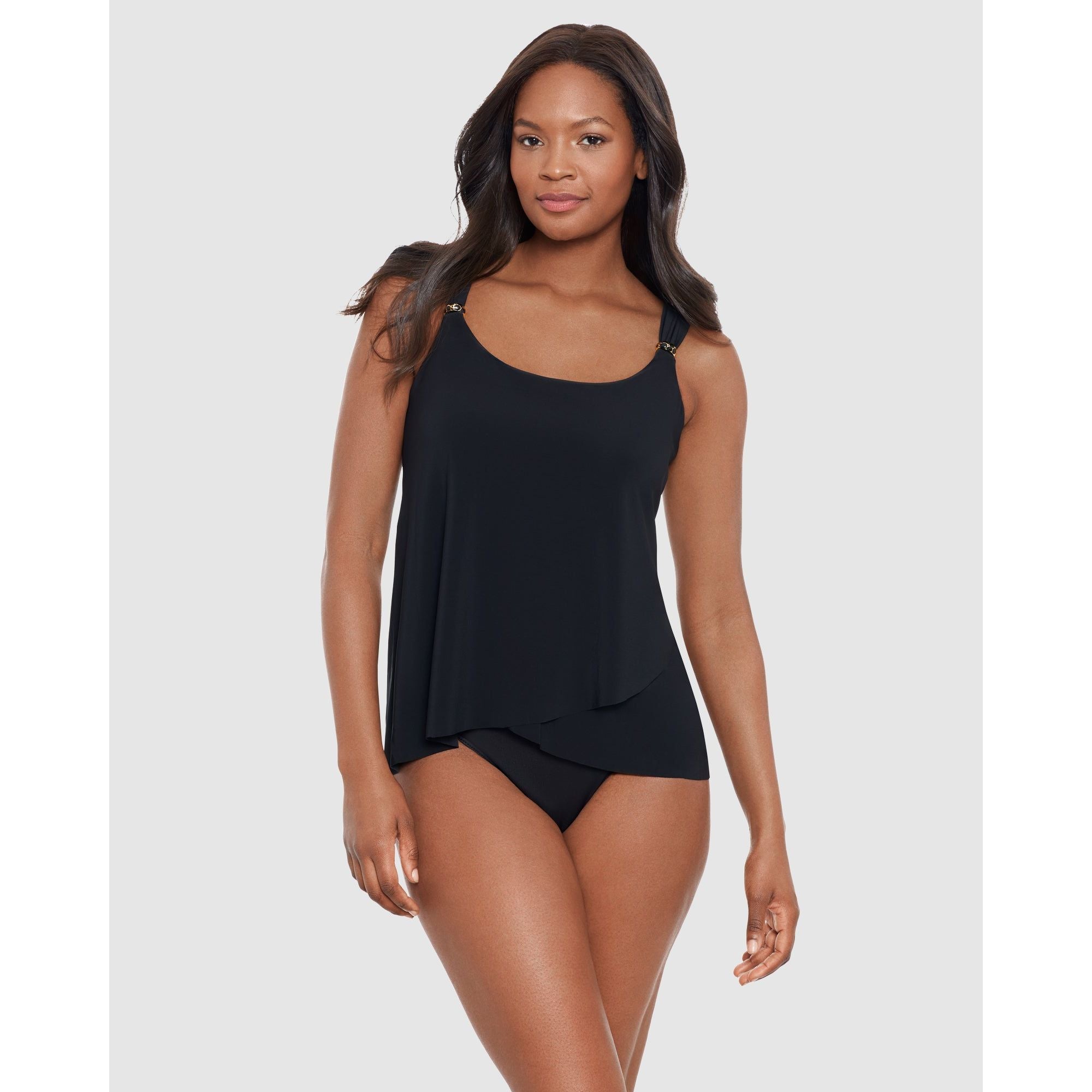 Be chic, comfortable and fully supported too in this underwired tankini top designed especially for DD cup sizes, which features a hidden underwire bra for lift and shaping. It's a wide strap tankini with stylish hardware at the front and sliders to adjust the length at the back, and has an elegantly-draped front to fully conceal your tummy.