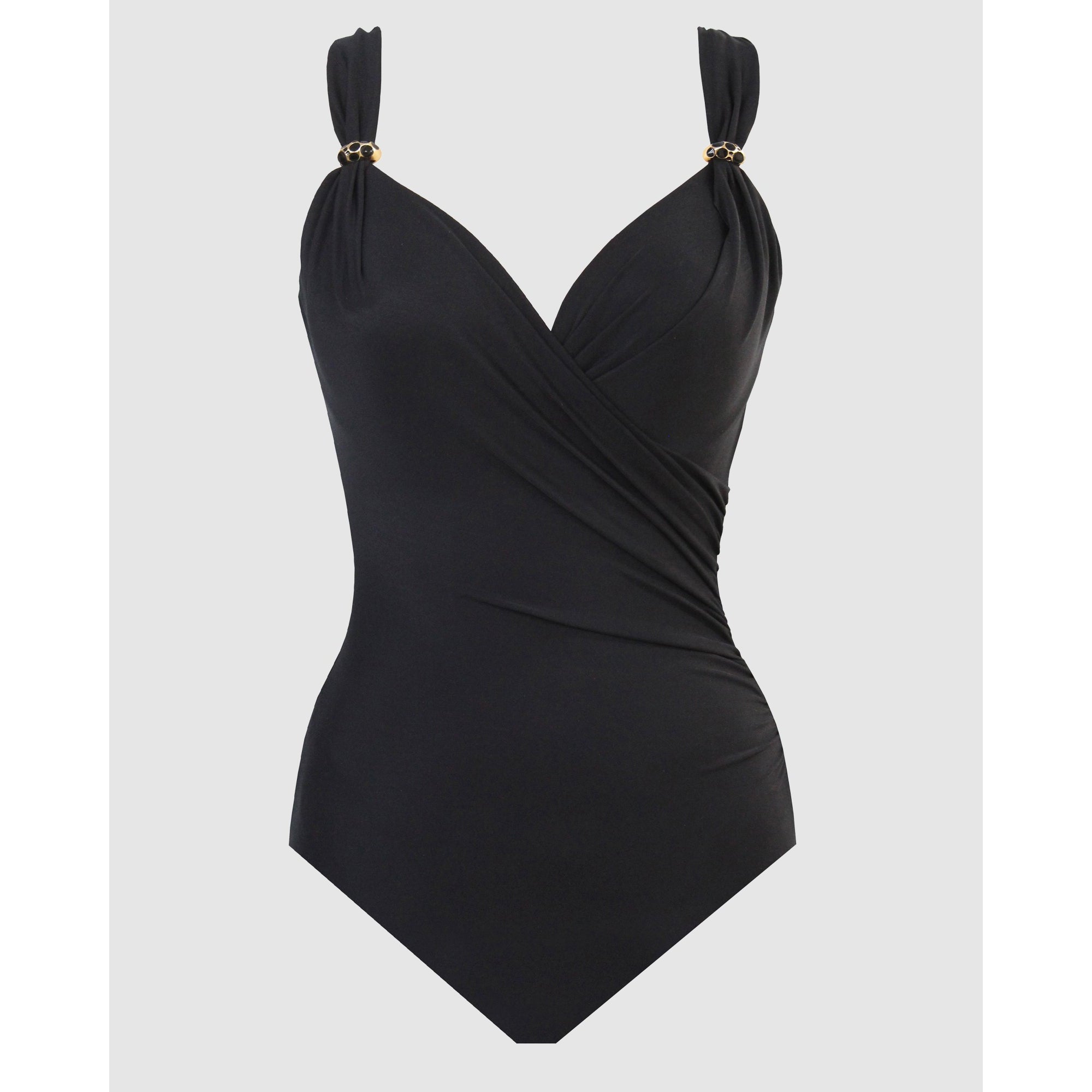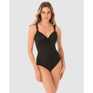 This one-piece swimsuit cleverly molds hourglass curves, so you can feel more confident than ever by the water. A single-layer of Miratex fabric provides all the body-smoothing and tummy-flattering control you need without added shaping panels, while a crossover neckline and subtle draping detail creates the illusion of a smaller waistline. This slimming, shaping swimsuit also features foam cup lining and hidden underwires for lift and support.