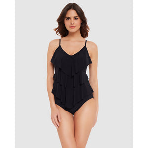 Banish body worries with this stylish tiered tankini top, which features 3 layers of draped fabric to hide your tummy and gracefully lengthen the torso plus a hidden layer of shaping fabric below.. Designed especially for DD cups, it features soft cups for comfortable support while you swim, plus a bust-accentuating plunge neckline to create a fashionable silhouette.