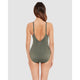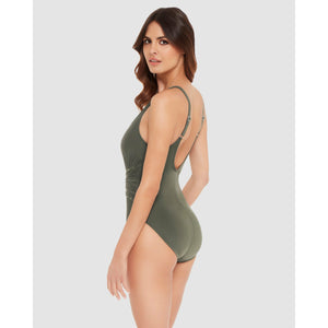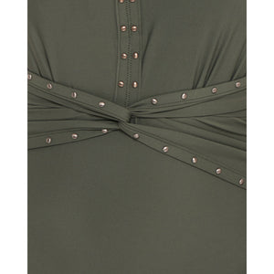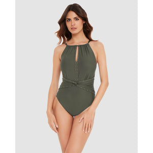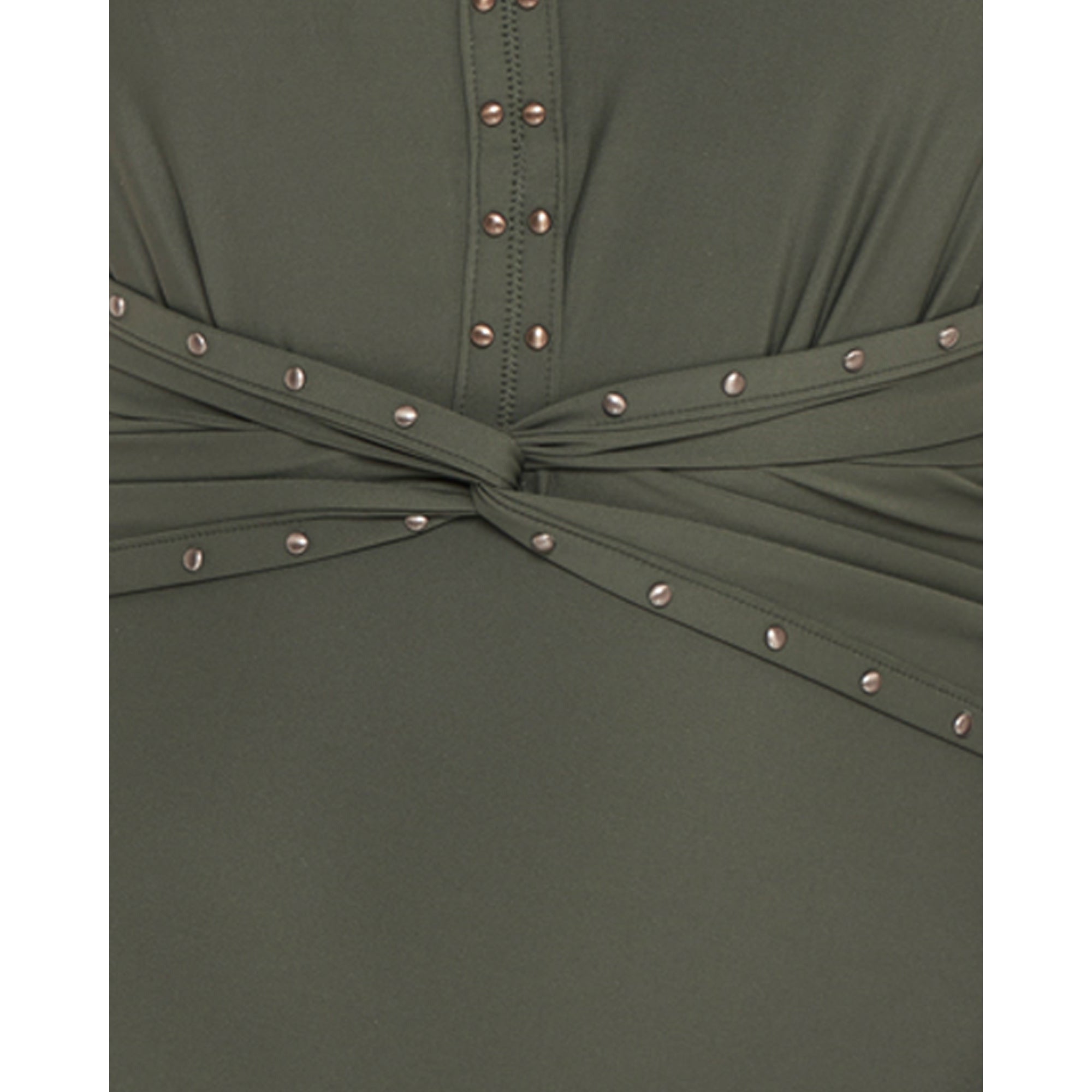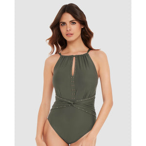 Turn heads in or out of the water in this ultra-stylish tummy control swimsuit. The high neck front is contrasted by a low cut back, and the design features a waist-defining knot detail plus bronze-tone metal rivet trims. Made from slimming fabric to hold in your tummy and smooth your back, it also has optional padding to give your bust a subtle boost.
