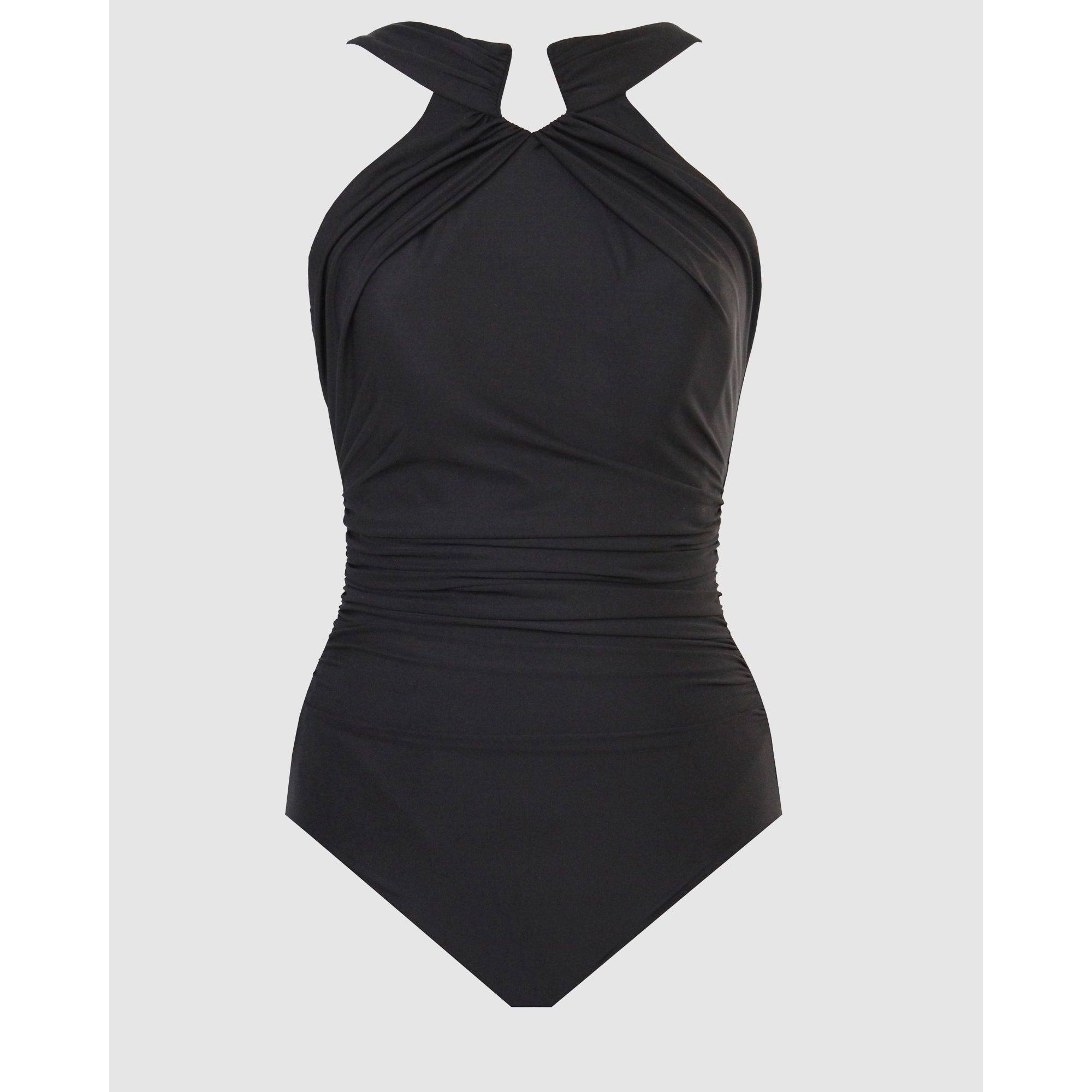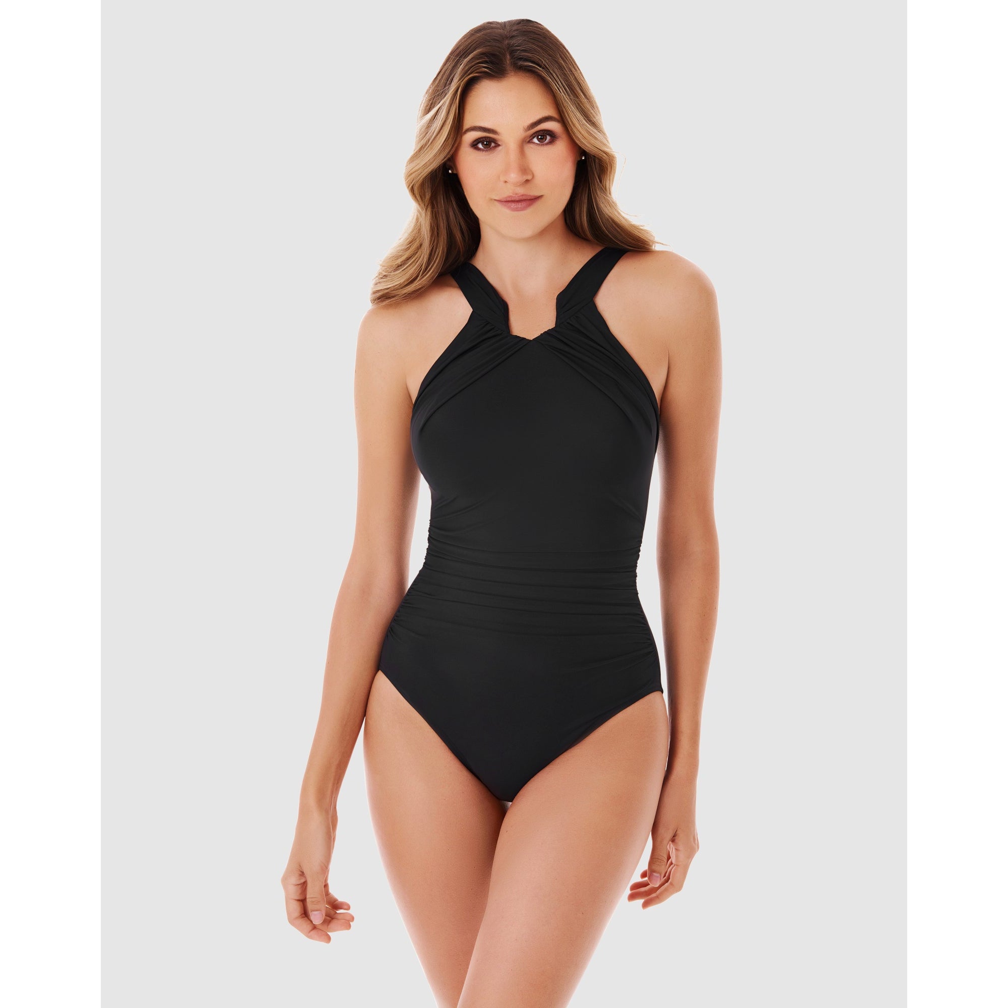 Flatter your tummy and waist in this elegant one-piece swimsuit. Designed by one of the world's leading shapewear brands, it's made from slimming and smoothing Miratex fabric. The eye-catching high neck design resembles a halter, but has standard straps at the back so that no weight is getting put on your neck. Tummy-flattering ruching completes the look, for a bathing suit you'll feel truly beautiful in.