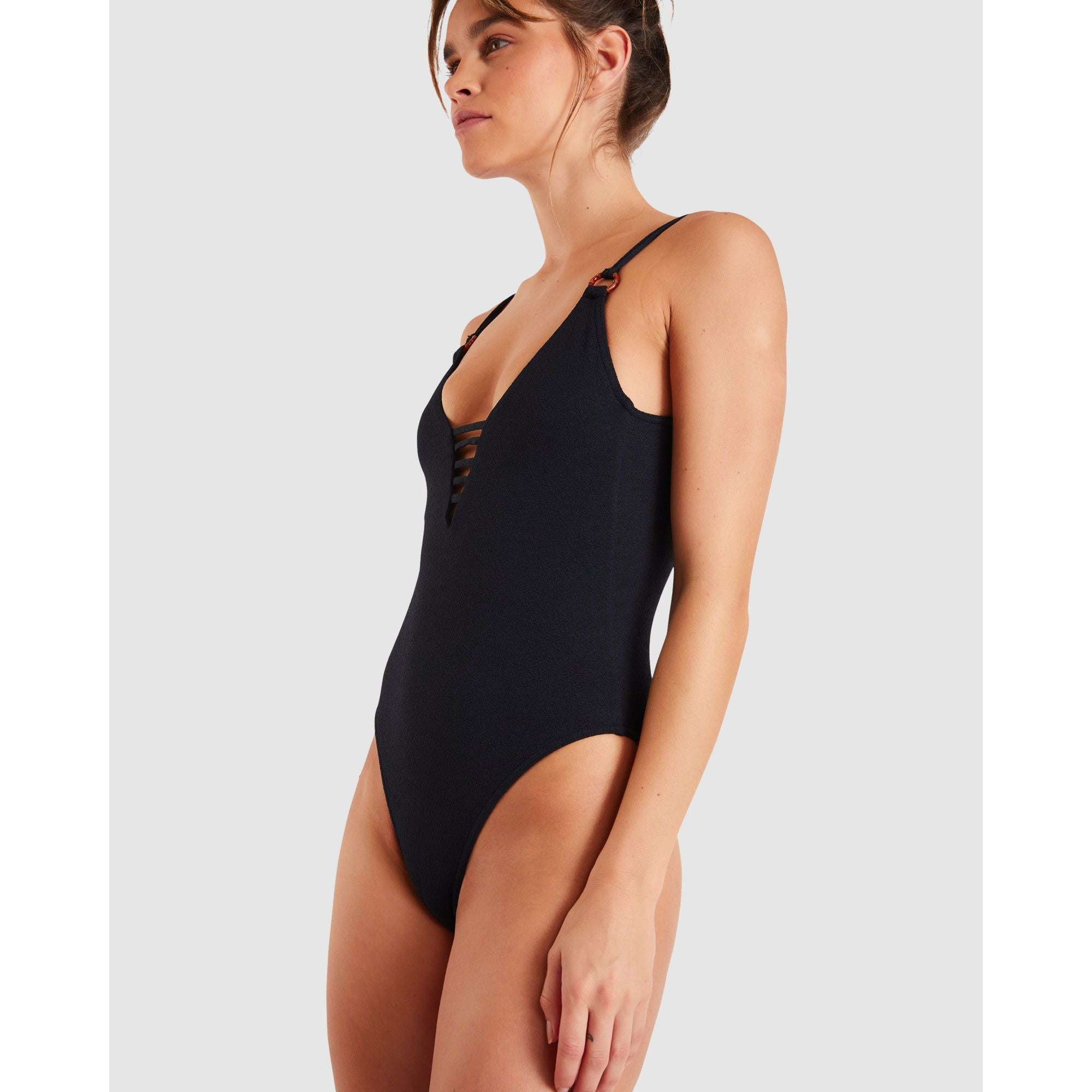 Stand out in this plunge swimsuit in chic textured fabric (great for also styling as a top away from the beach!), which has bamboo rings on the straps and strappy detailing at the centre of the neckline. The high leg, low back swimsuit shape is ultra flattering, and it comes with removable cup padding for optional bust shaping.