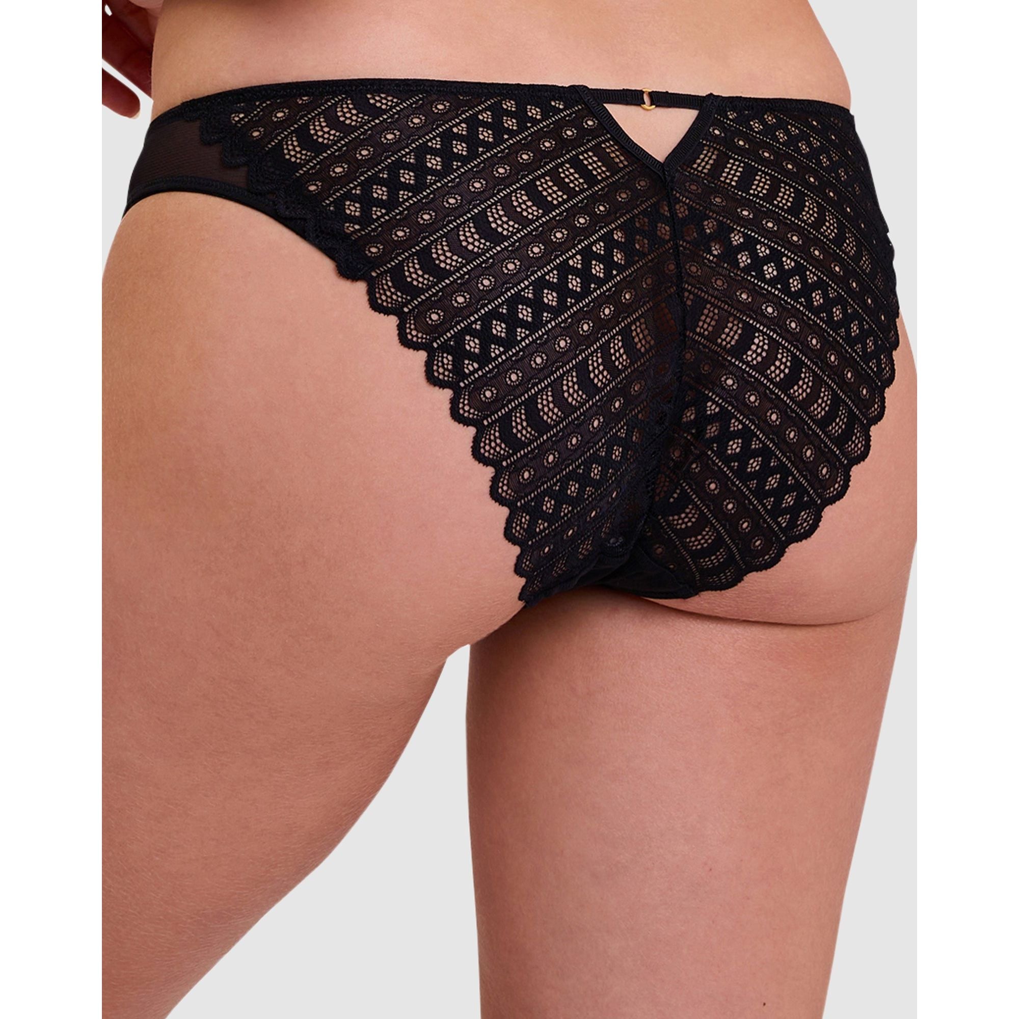Made with at least 61% recycled fibres, this sultry lace brief combines a graphic geometric pattern with romantic scalloped edging, plus panels of sheer mesh at the sides. A triangular cut-out and gold ring detail at the back completes this sexy bikini brief.