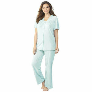 This short sleeve pyjama set is made from soft, silky and exceptionally-breathable nylon tricot-knit fabric, so you can sleep or lounge in total comfort. Part of the Exquisite Form Coloratura collection, these nylon pyjamas feature a button-up top with short sleeves, and long-leg pyjama bottoms with a comfy, covered elastic waistband. Satin-finish trims at the neck and hems add a pretty touch, along with gathered pleats and floral embroidered appliqués.