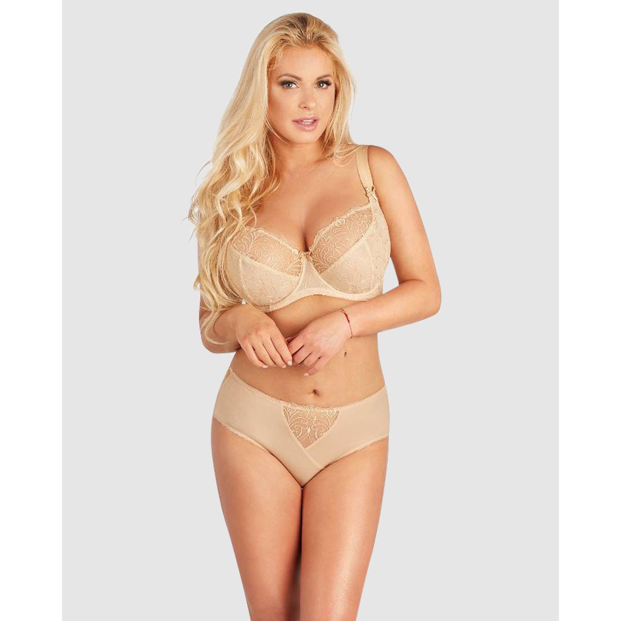 Sultry elegance meets excellent full bust support in this large cup bra made from a beautiful custom embroidery that features the Nessa butterfly logo. 3-part cups, a strong mesh band and plenty of full bust know-how make this an incredibly supportive bra for even the largest of cup sizes, but it still maintains a light and delicate look thanks to the sheer panels that trim the top of each cup.