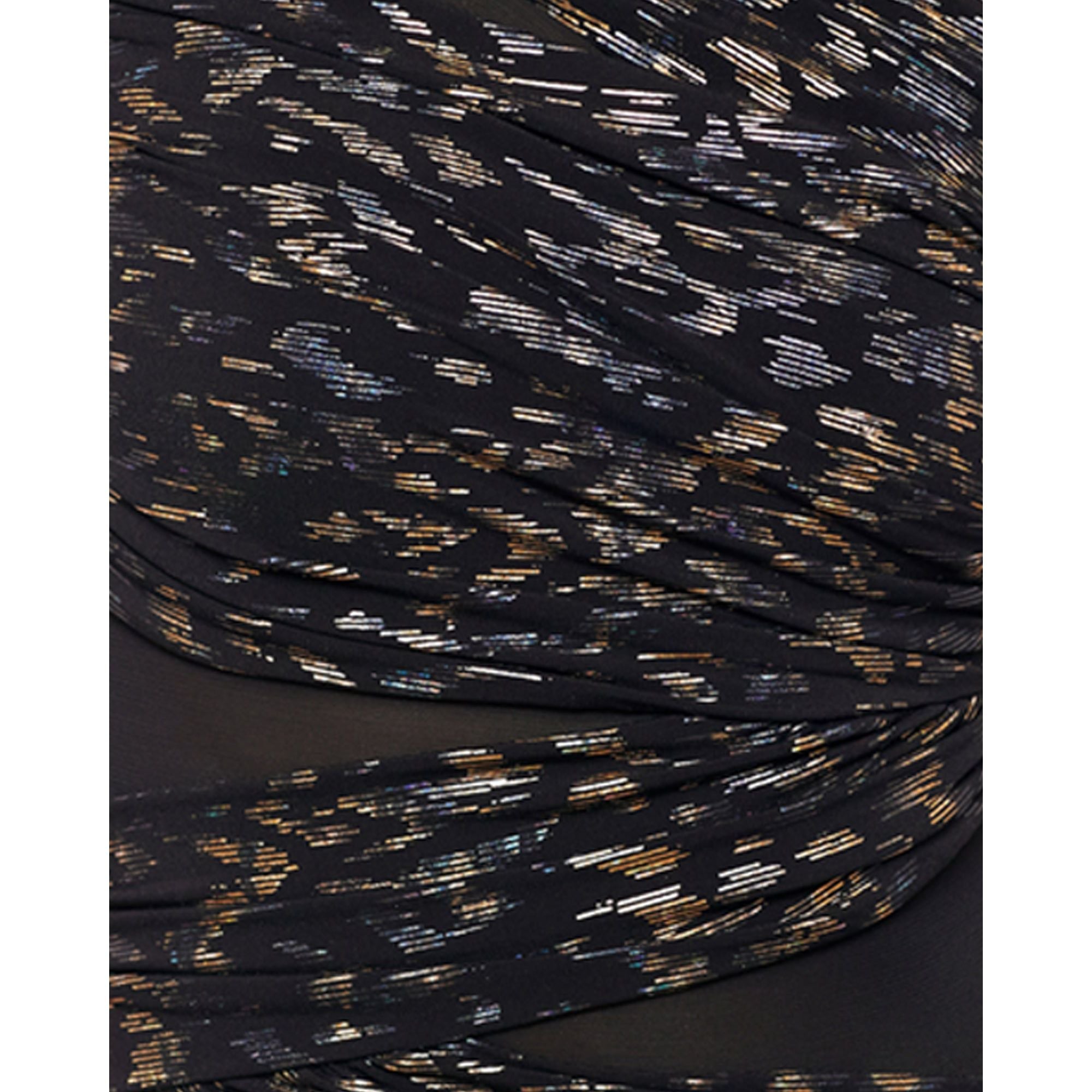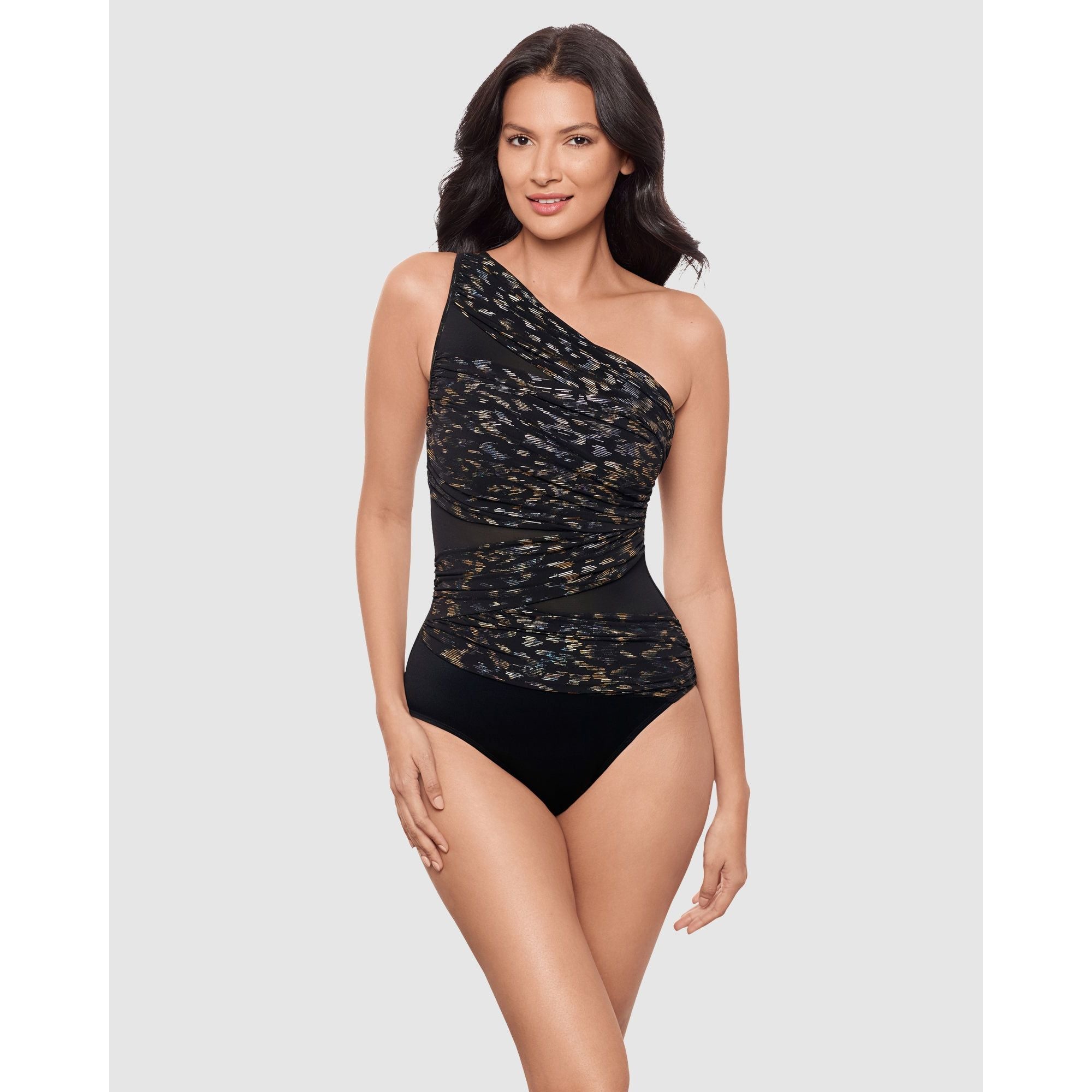 Sophisticated styling meets flattering shaping in this asymmetric swimsuit design, which dramatically slims your figure through a combination of shapewear-effect fabric and illusion draping and panelling. Ruched fabric criss-crosses over a mesh background, revealing hints of sheerness, while the solid back creates a slender-looking figure from every angle.
