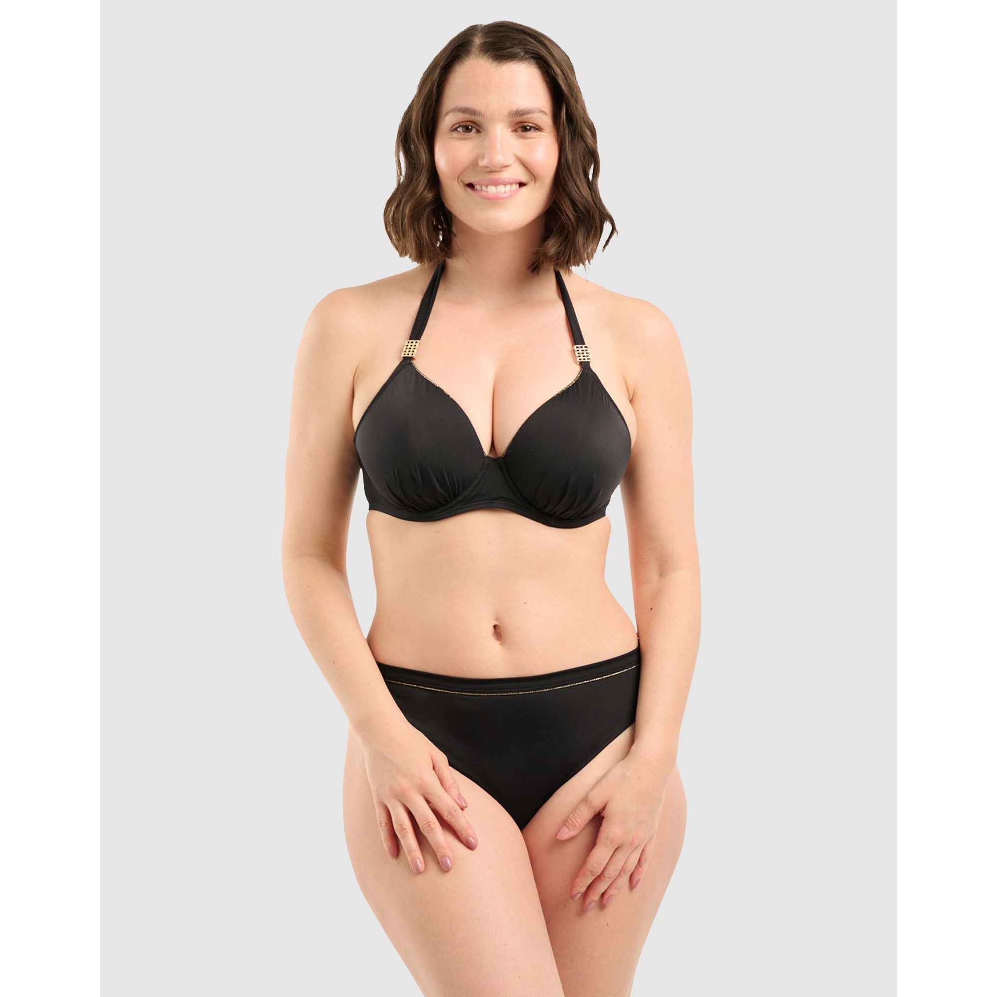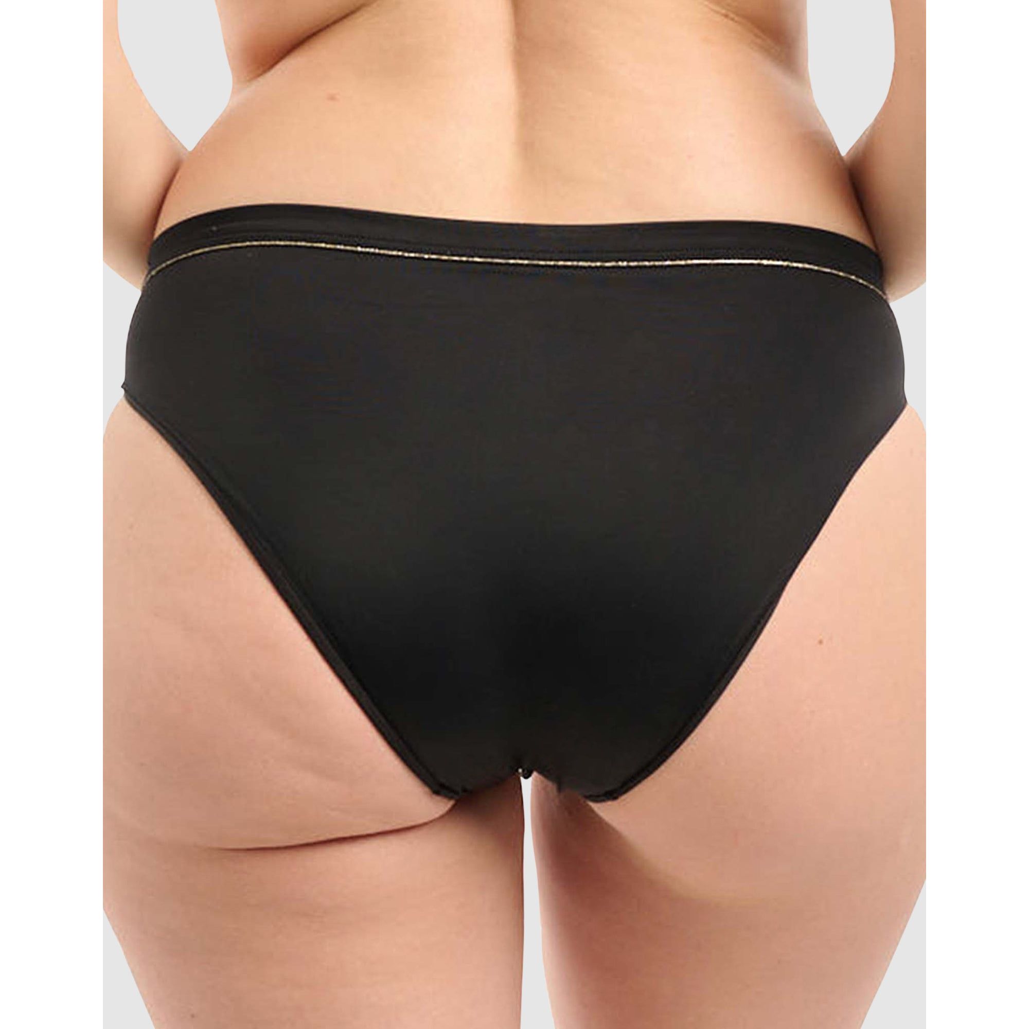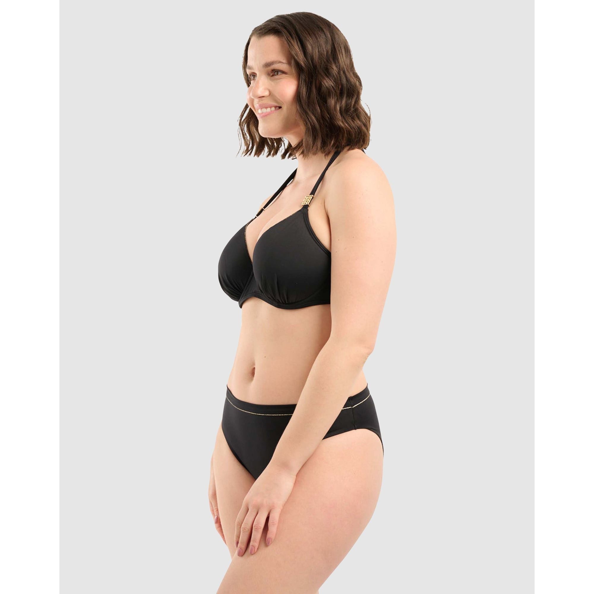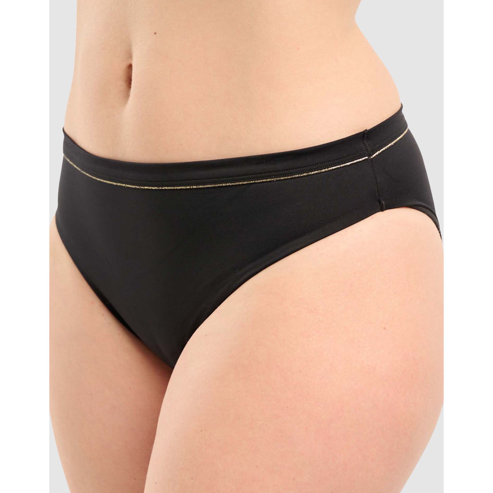 Elegant, feminine, and designed to sculpt fabulous curves, this medium rise bikini bottom is soft and stretchy with a shaping lining inside the front, and chic gold piping below the waistband. The sleek, smooth-fitting fabric is made with recycled polyamide from production thread offcuts.