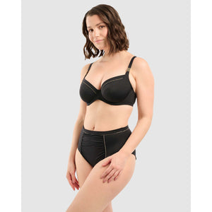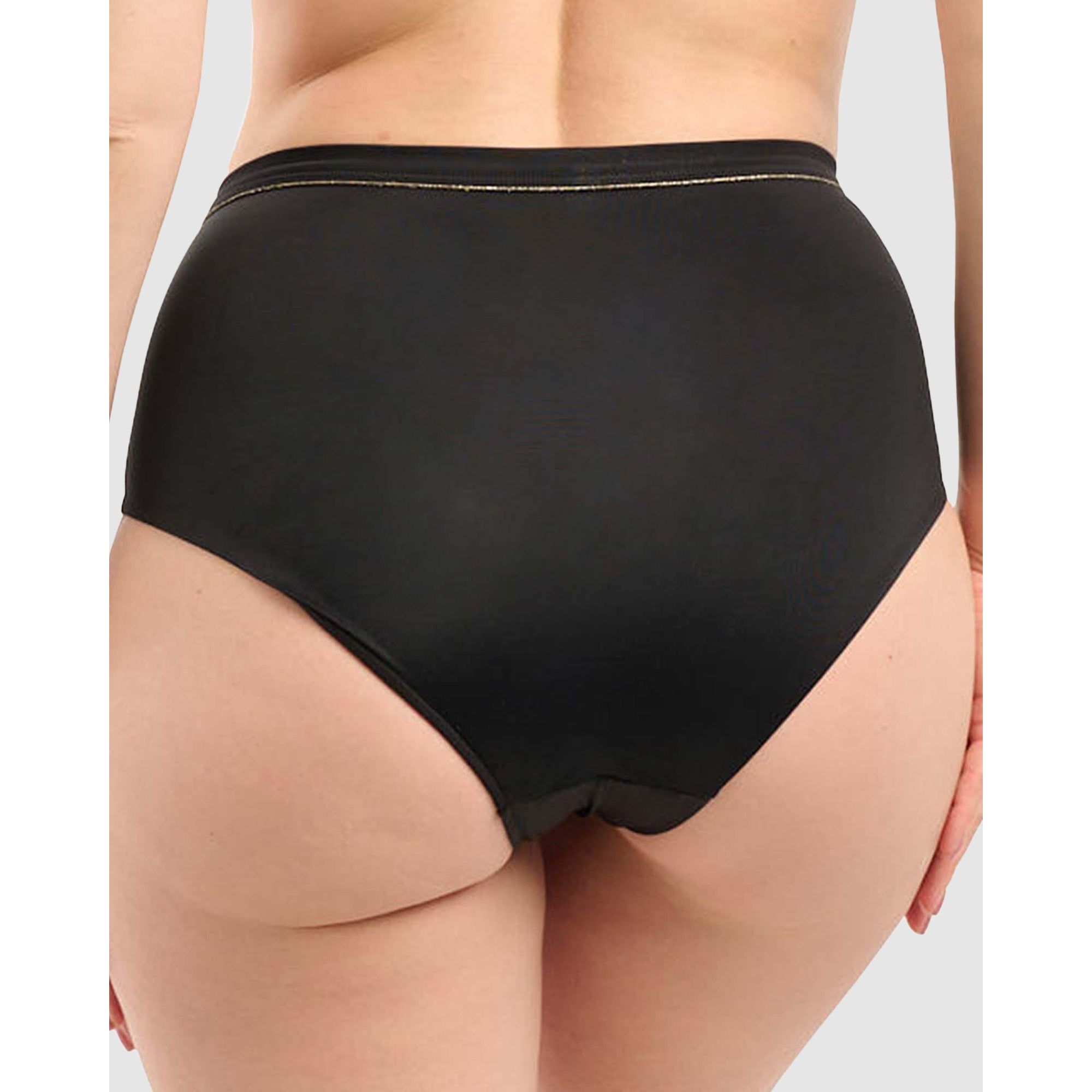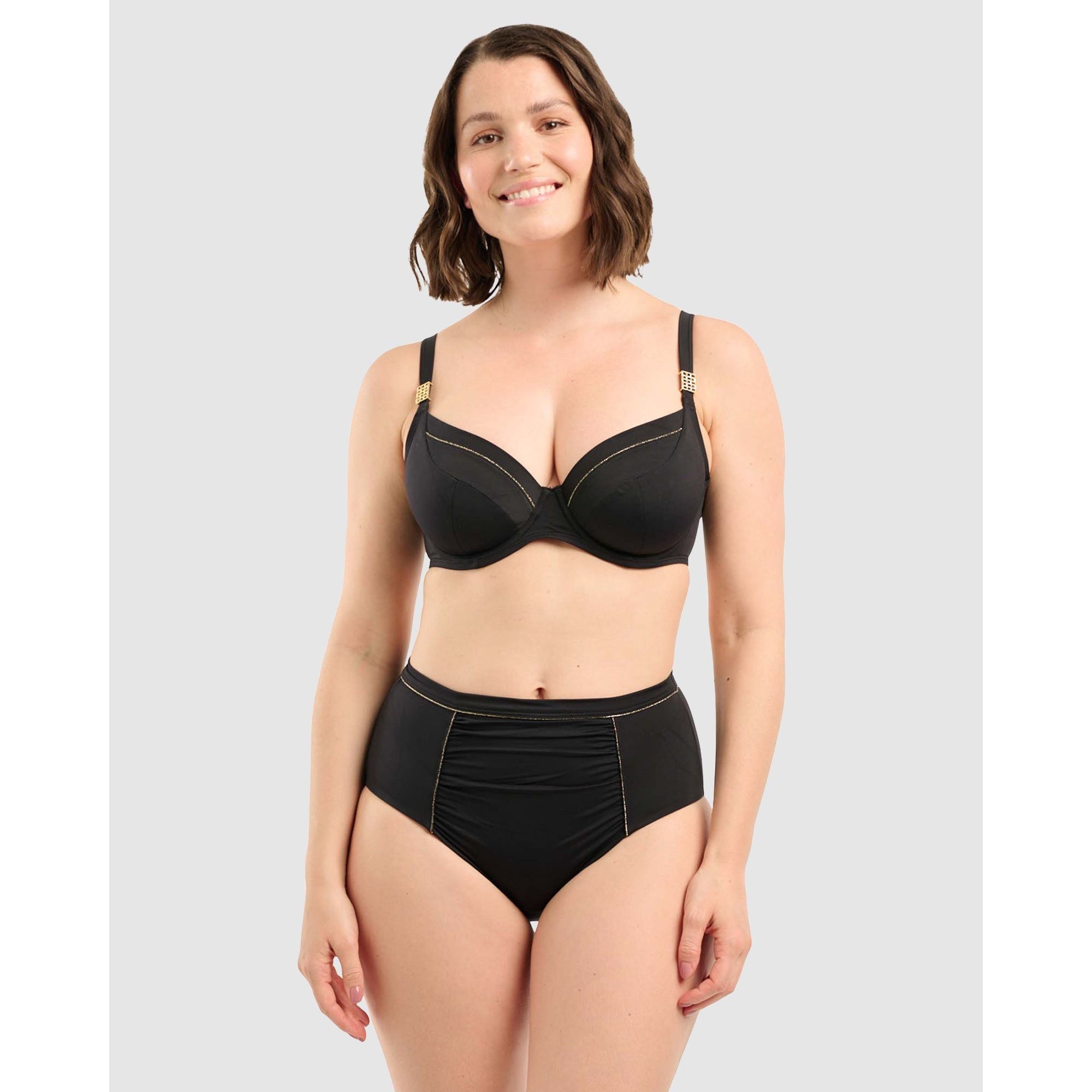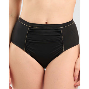 Elegance and luxury meet figure-flattering shaping in this high rise bikini bottom, which features a lined front and ruched panel that detracts attention from tummy worries. The moderately high-cut legline visually lengthens your legs, while the gold piped outlines add a chic touch that will sparkle under the sunlight.