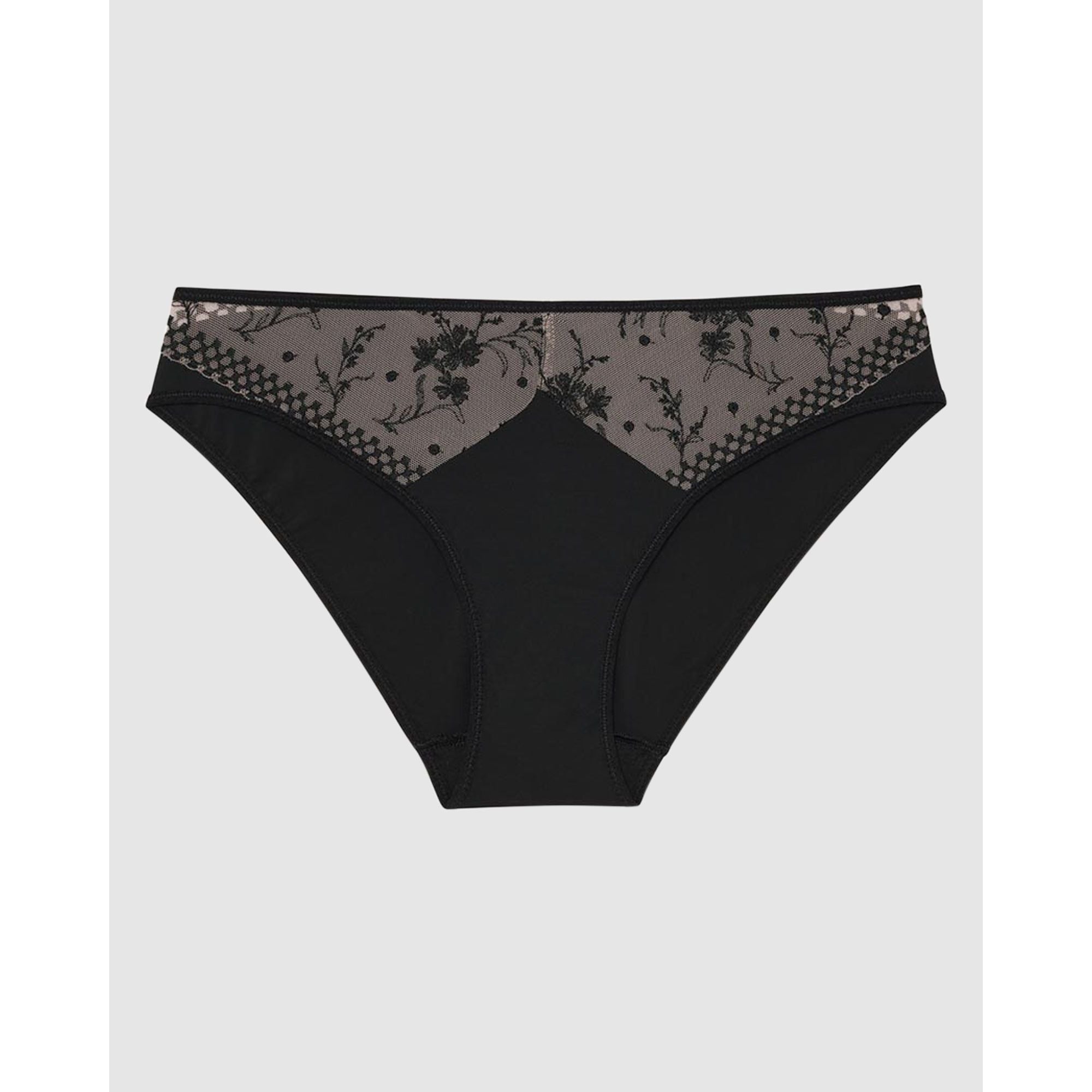 Blending floral embroidery with super-soft microfibre, this bikini brief is stylish yet easy to wear - the perfect way to add a little French chic to your everyday lingerie rotation. Scattered floral motifs on the sheer tulle front are contrasted by graphic edging which continues around the hips.