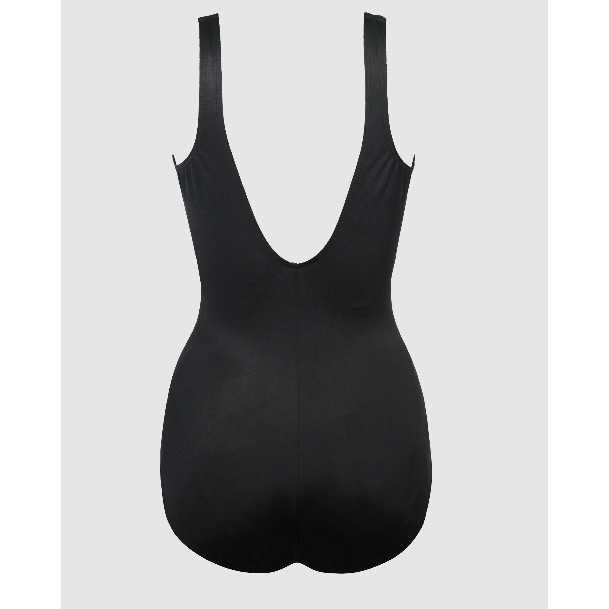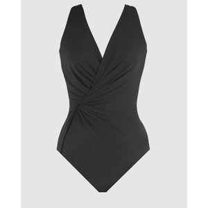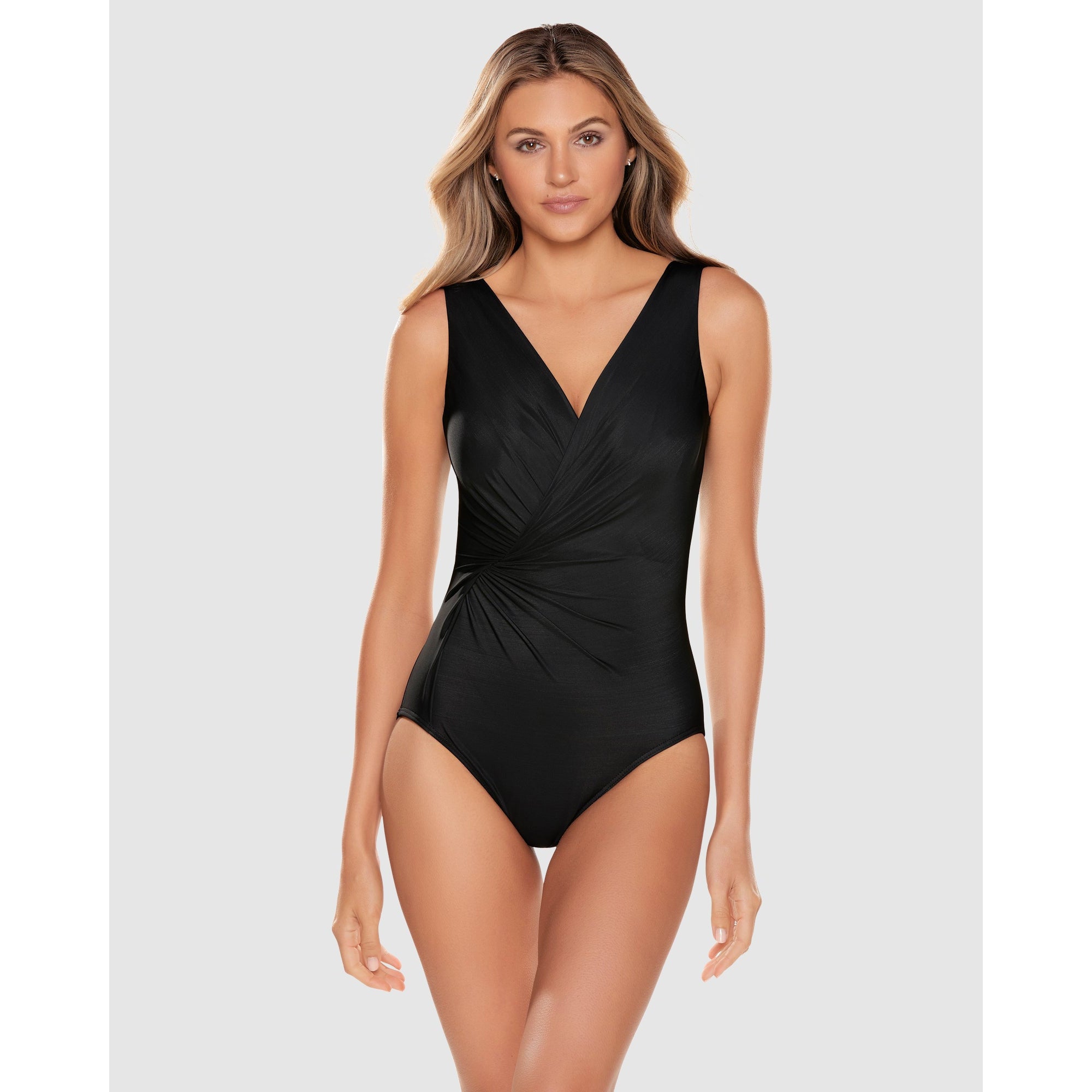 This one-piece swimsuit will become your new favourite beach look thanks to its supremely-flattering design and body-shaping fabric! It's made from Miratex, a single-layer control fabric that slims and smooths without the need for added lining or shaping panels. The gathered crossover creates a sexy plunge neckline, as well as the illusion of an hourglass waistline. Plus, this control bathing suit comes with hidden underwire so that you stay feeling supported.