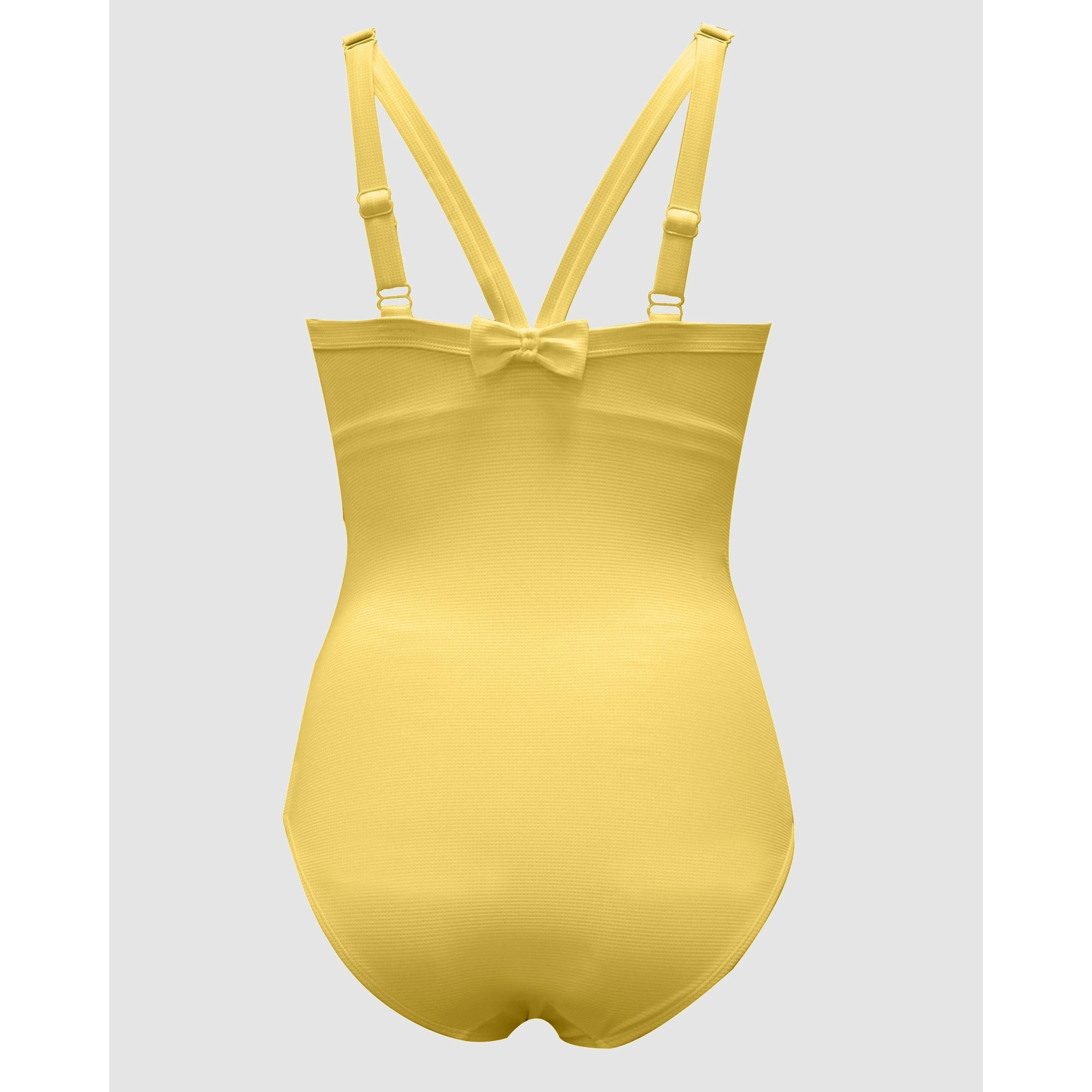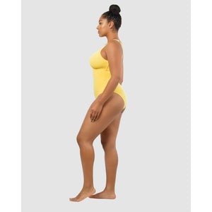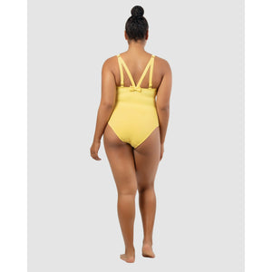 Created by full-bust specialists Parfait, this one piece swimsuit features a cleavage-flaunting plunge V neck, but also a hidden shelf bra with a wide underbust band to deliver lightweight support and keep the neckline in place. It's a high back swimsuit with chic Y-shaped shoulder straps, culminating in a minimalist bow adornment.