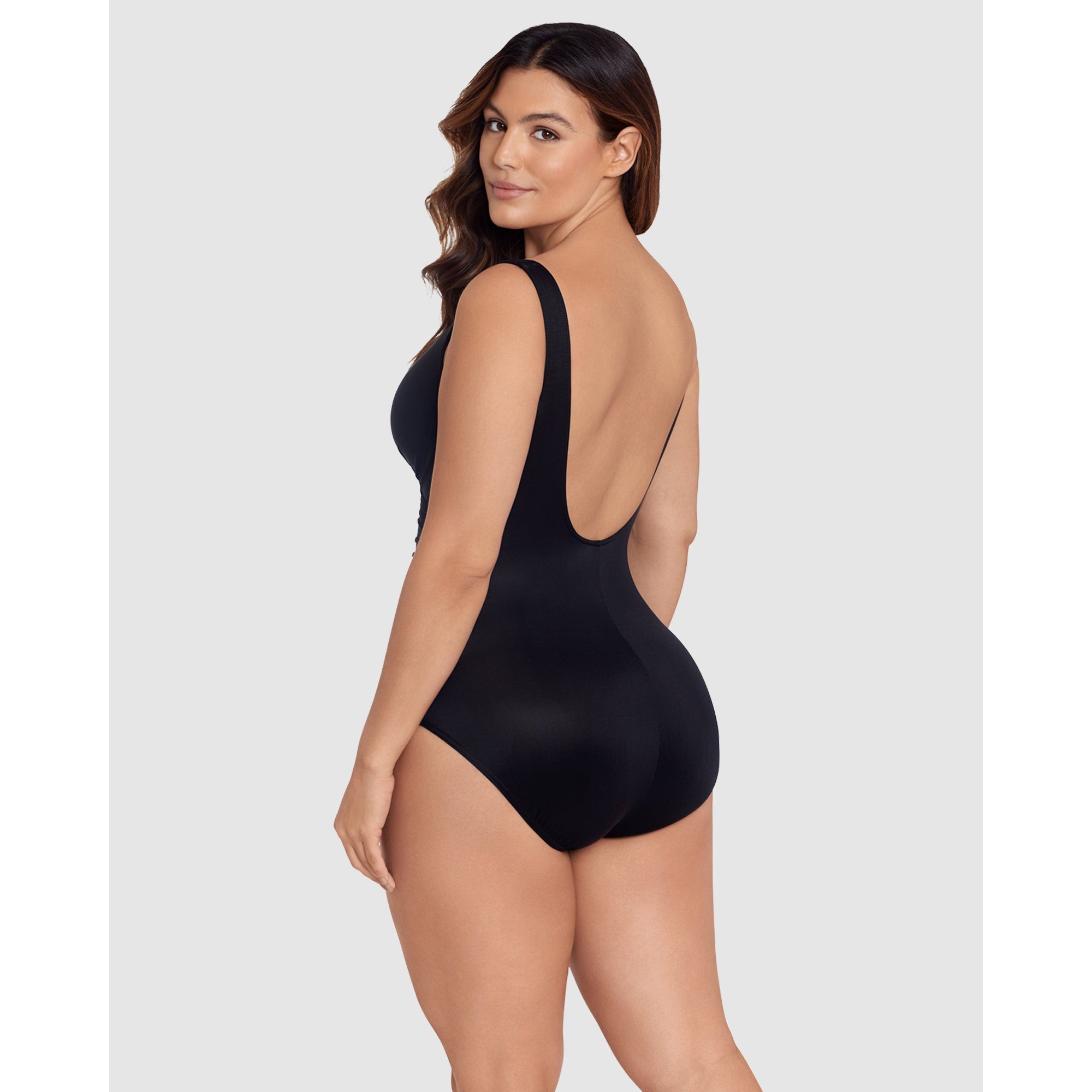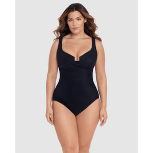 Step into this one-piece swimsuit and discover a slimmer, shapelier new you! Made from Miraclesuit's powerful Miratex fabric, it provides all-over control without relying on linings or shaping panels, for maximum smoothness with no added bulk. This slimming bathing suit also has underwired cups with moulded foam padding, which frame a stylish cut-out detail. It's finished with gathering that flares out from one side of the waist, to visually enhance the hourglass effect.