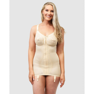 Whether you're a fan of vintage style lingerie or firm control shapewear, you'll love this elegant bodyshaper which delivers powerful shaping while remaining easy to get into thanks to the zip-up front. Other key features of this corselette include wide shoulder straps, seamed wirefree cups to support your bust, and four attached suspender straps to hold up stockings.
